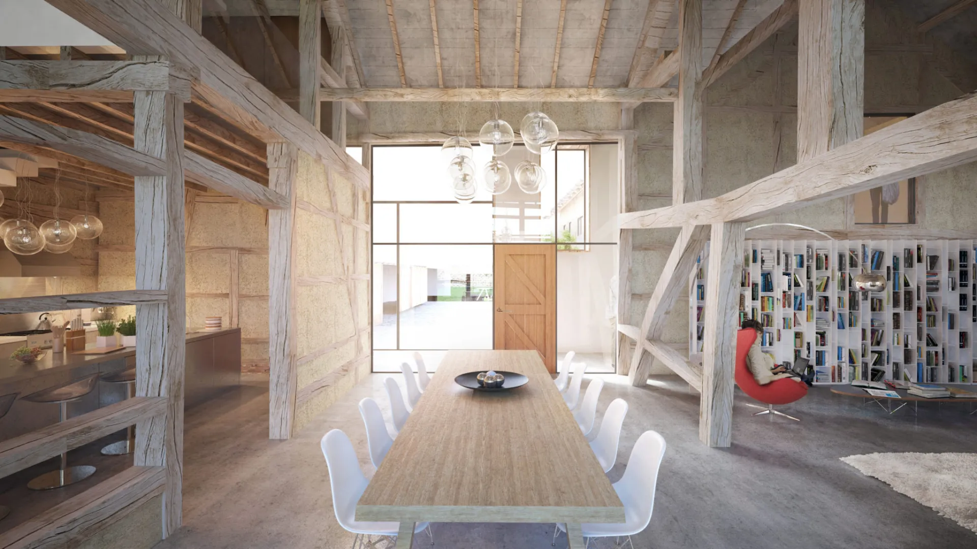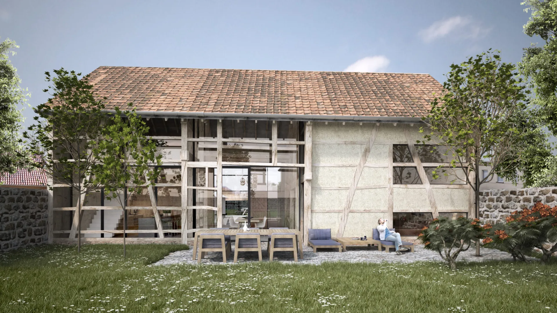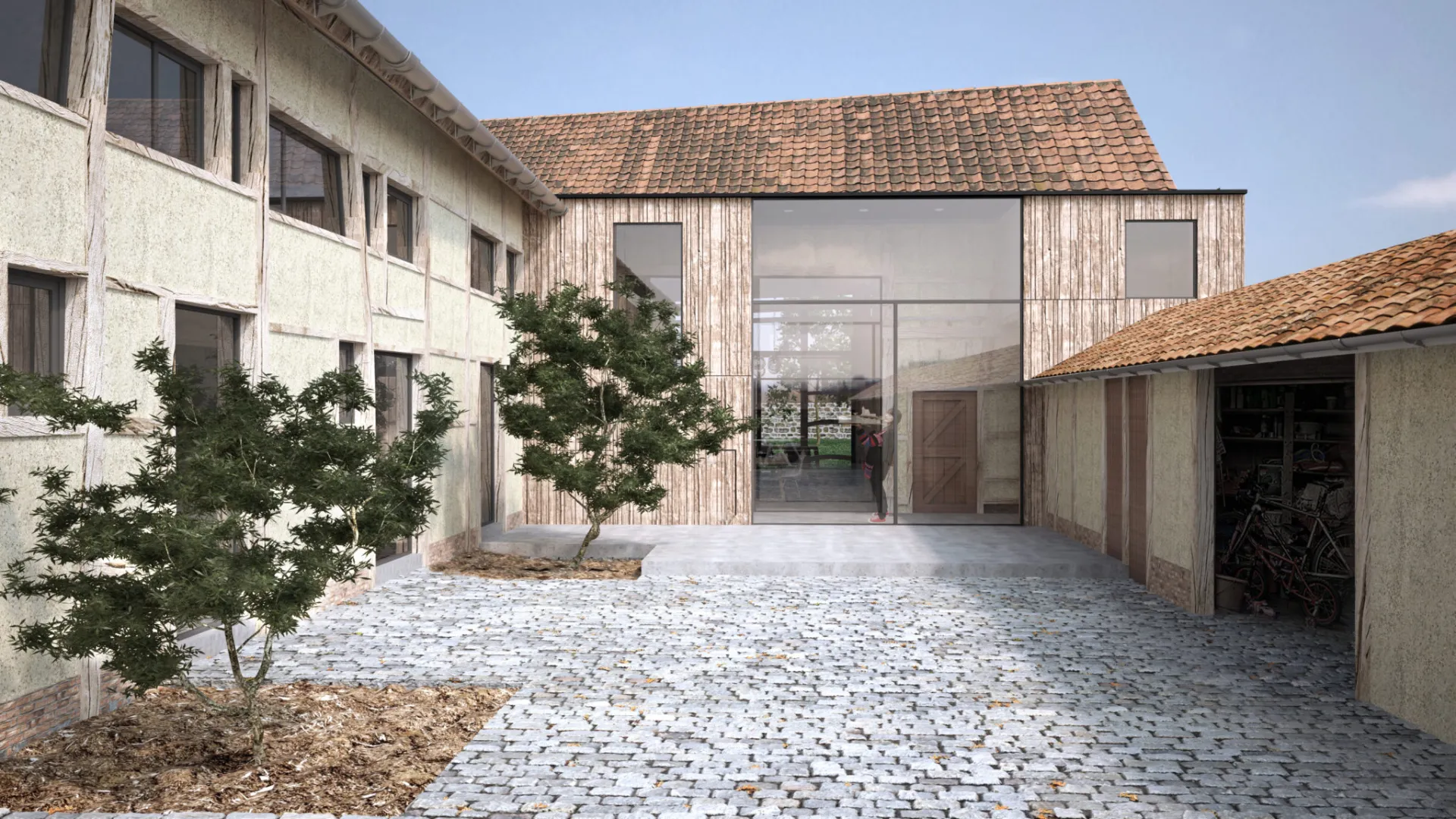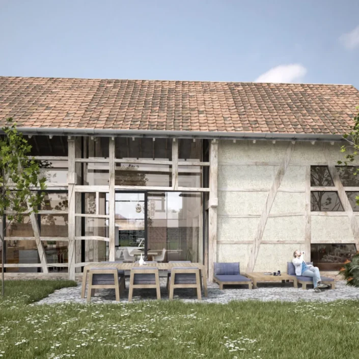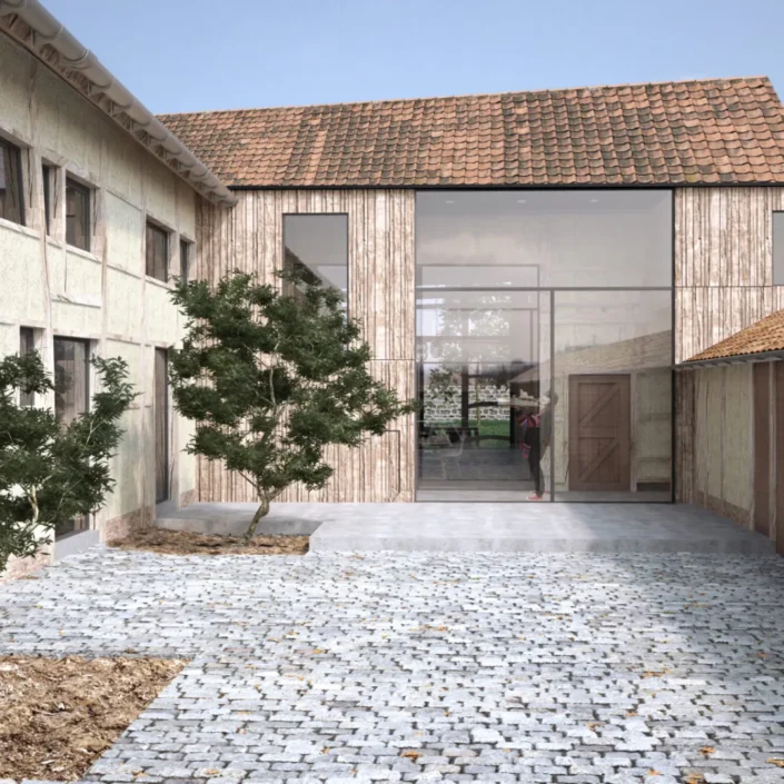 Achter de voorgevel in baksteen zit een traditionele vakwerkhoeve verscholen. Door de verschillende volumes te ontmantelen, is een grondig renovatie mogelijk. De originele balken en spanten komen op een nieuwe fundering. Waardoor het pand een gezonde basis vindt voor een lange toekomst. Een strak hedendaags volume verbindt de drie oorspronkelijke gebouwen. Zo combineer je het beste van toen en nu tot een geheel dat klaar is voor morgen.