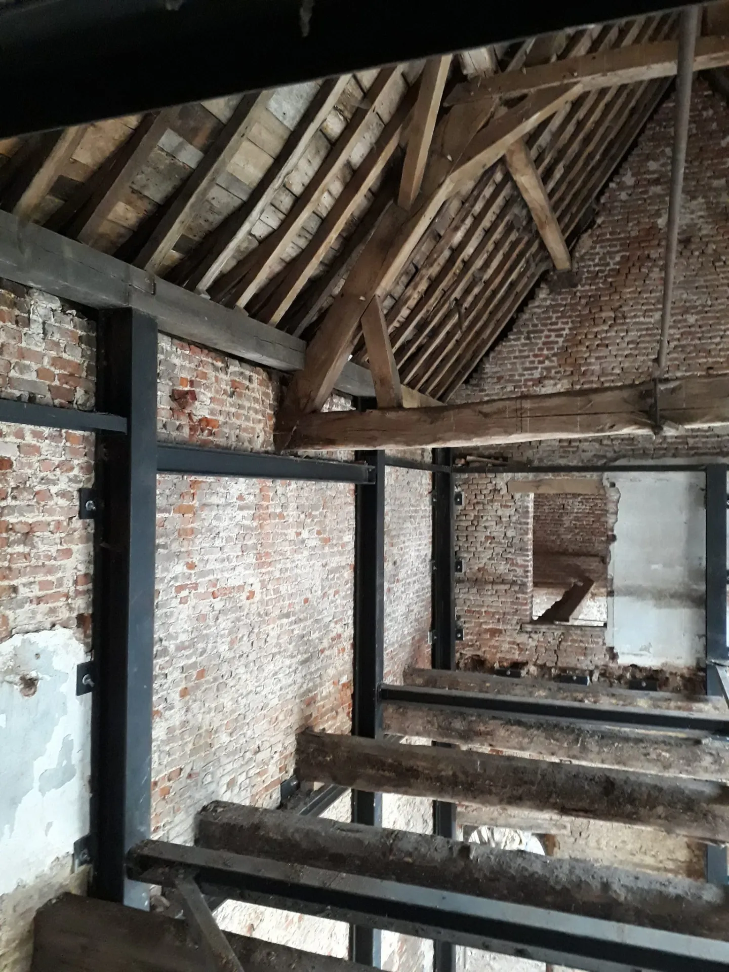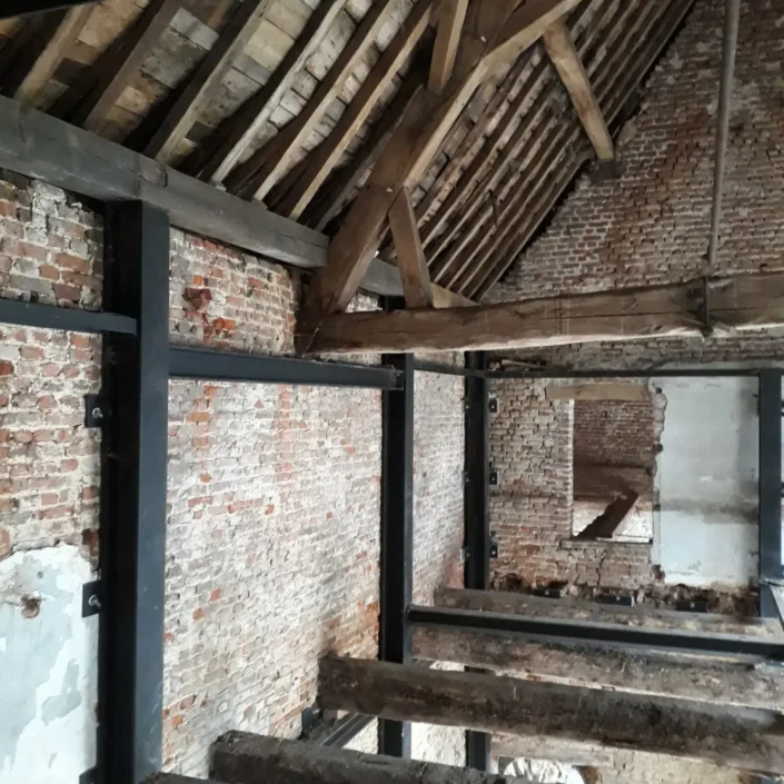 Kasteel Hasselbroek is een geklasseerd kasteel. ARCHICON begeleidde de restauratie en de instandhouding van een imposante zijvleugel. Door die ingreep blijft het kasteel gevrijwaard van verder verval. Zo kunnen ook volgende generaties genieten van het fascinerende gebouw. Omdat de zijvleugel heel instabiel was, bouwden we binnen een staalconstructie die het gewicht van de muren en het dak overneemt. Daarna volgde de restauratie van het dak zelf. Elke stap verliep in nauw overleg met Agentschap Onroerend Erfgoed van de Vlaamse overheid.